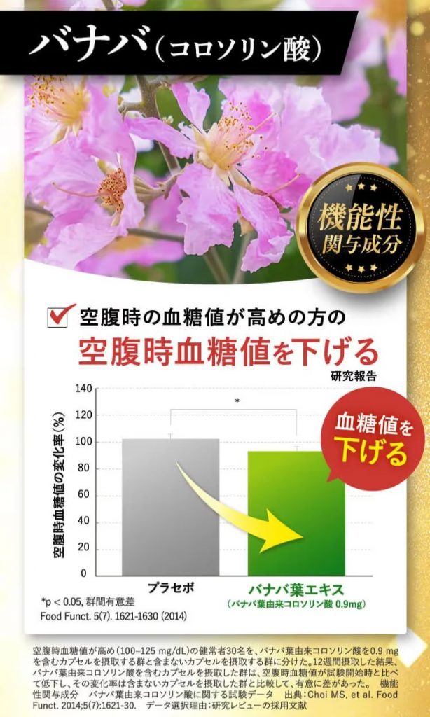 バナバ葉由来コロソリン酸は、空腹時血糖値が高めの方の空腹時血糖値を下げる機能があると報告されています。